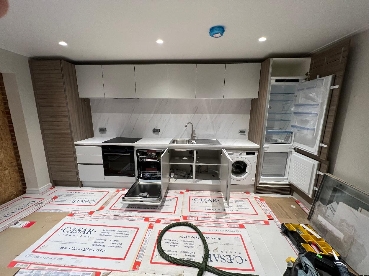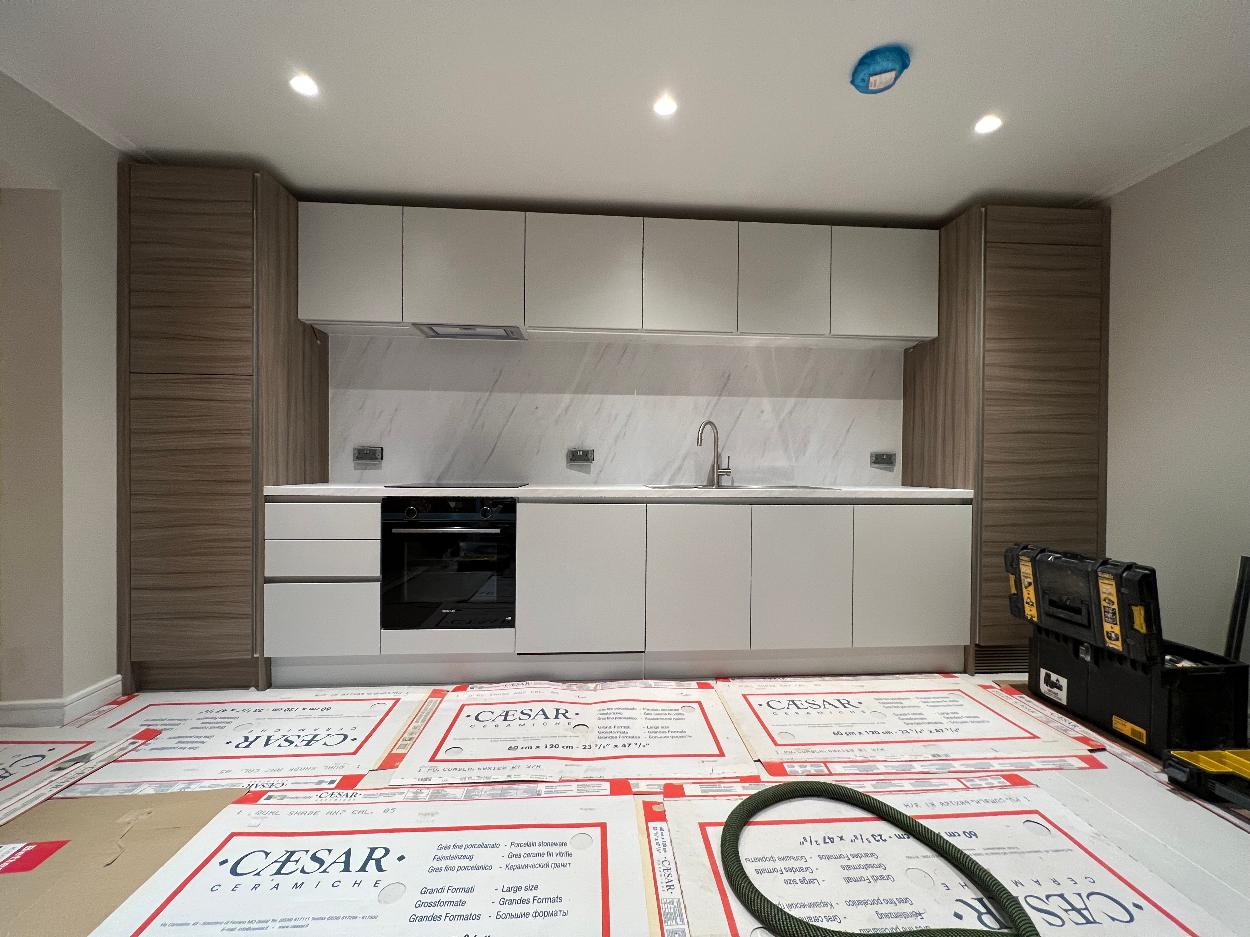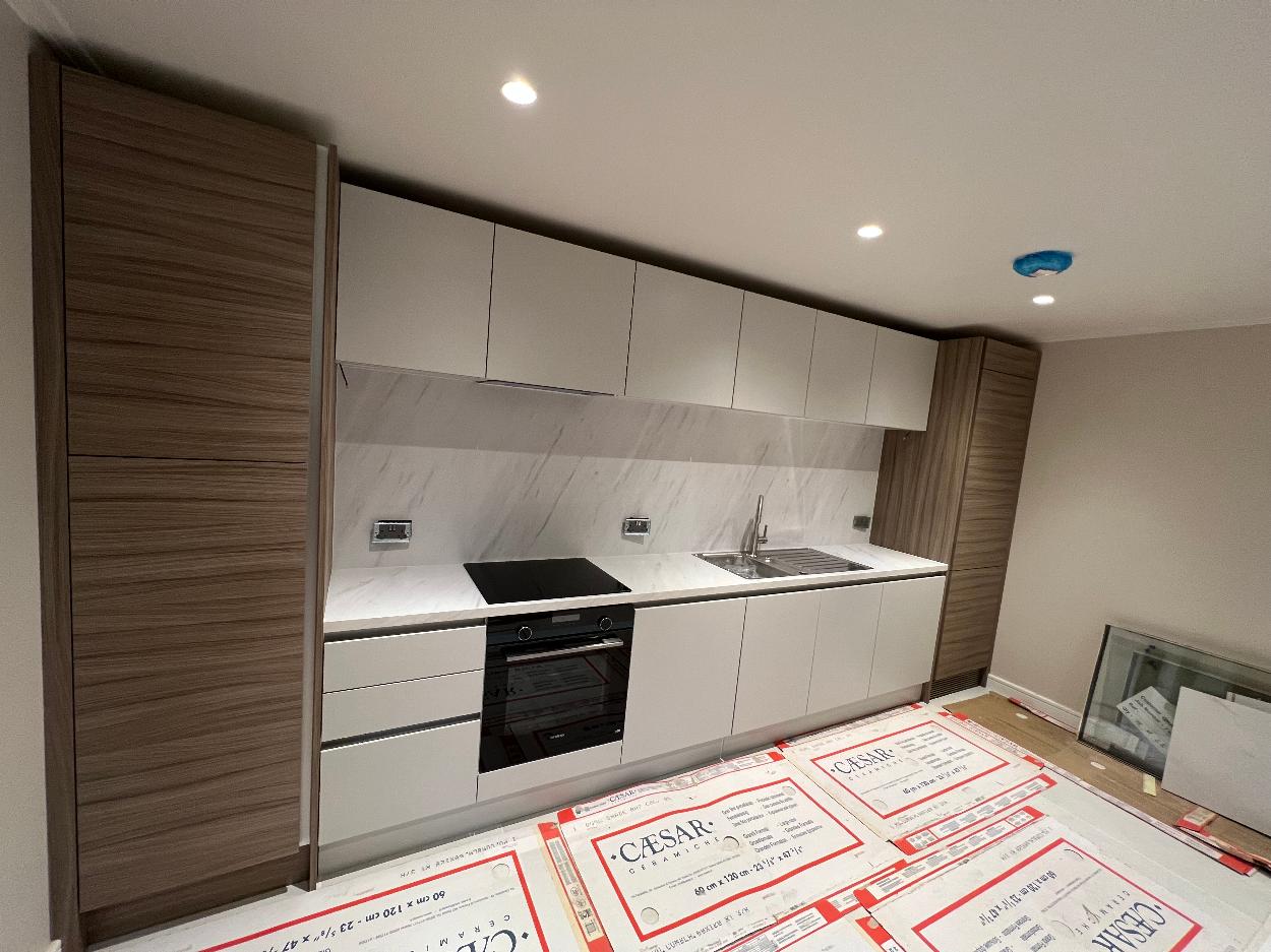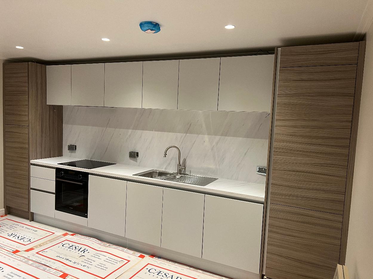 Bespoke Handleless Kitchen in Woking Bespoke Handleless Kitchen in Woking with LED's. Materials used: Carcass 18mm White Tall unit doors - 18mm Shorewood Cabinet doors - spray painted Light Grey Custom Led's Splashback: 18mm Levando Marbe Soft close Made to measure Click below to see our work! See our Work