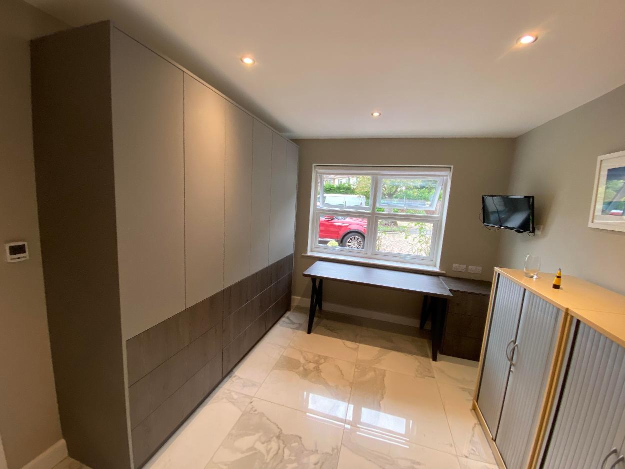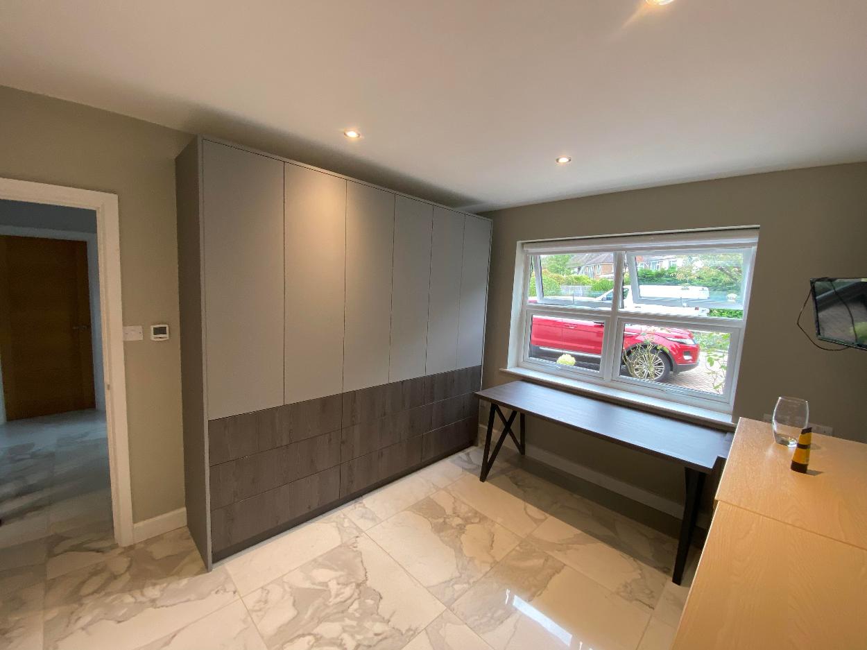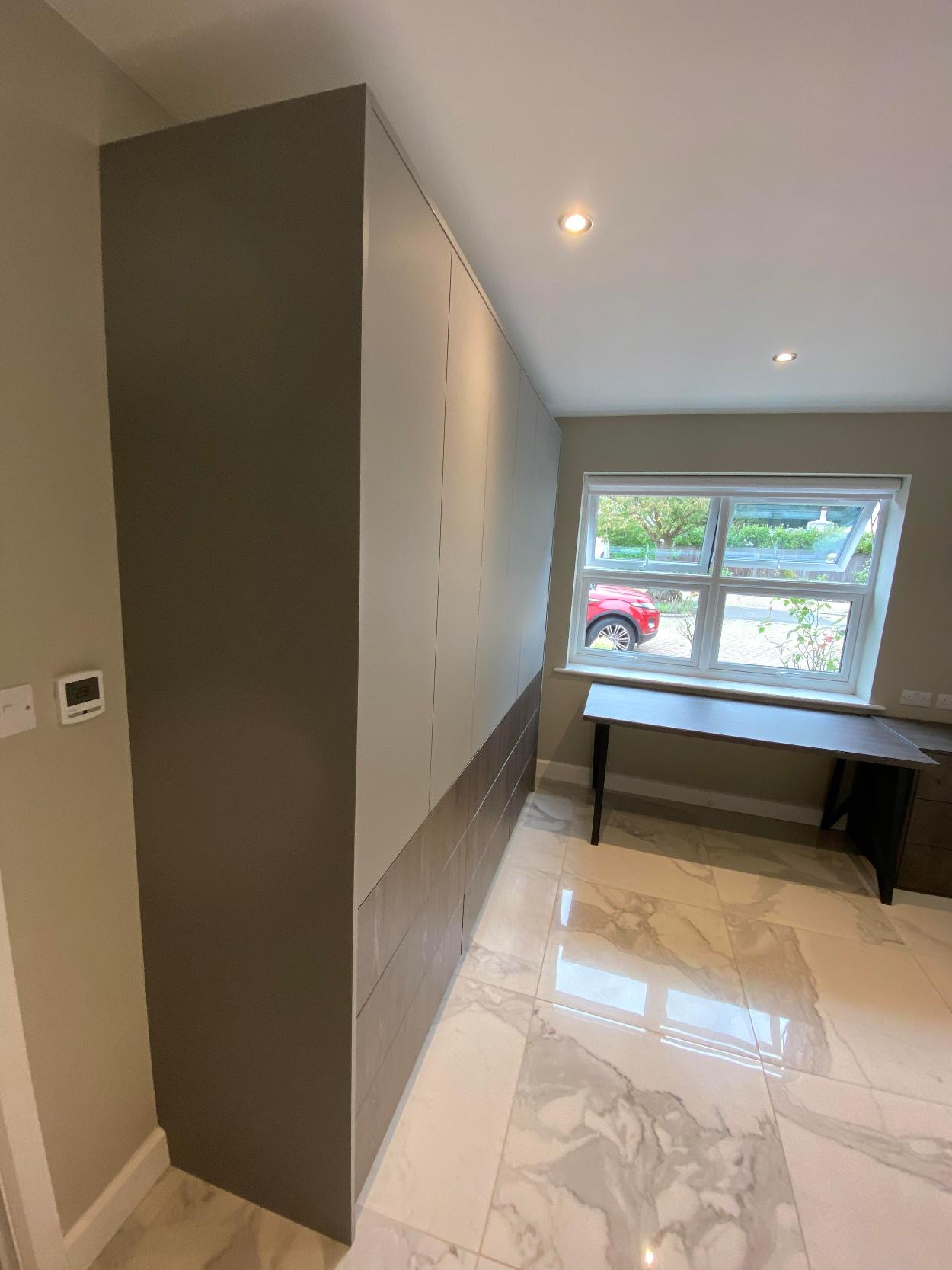 Coloured and Modern Home Office in Woking Combination of Dust Grey Perfect Sense and Anthracite Mountain Larch gave the luxurious modern style to this spacious home office. Materials used: 18mm EGGER board Perfect Sense Dust Grey 18mm EGGER board Anthracite Mountain Larch Click below to see our work! See our Work