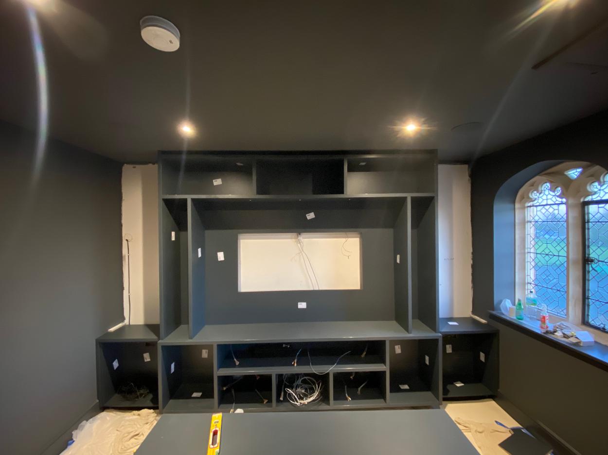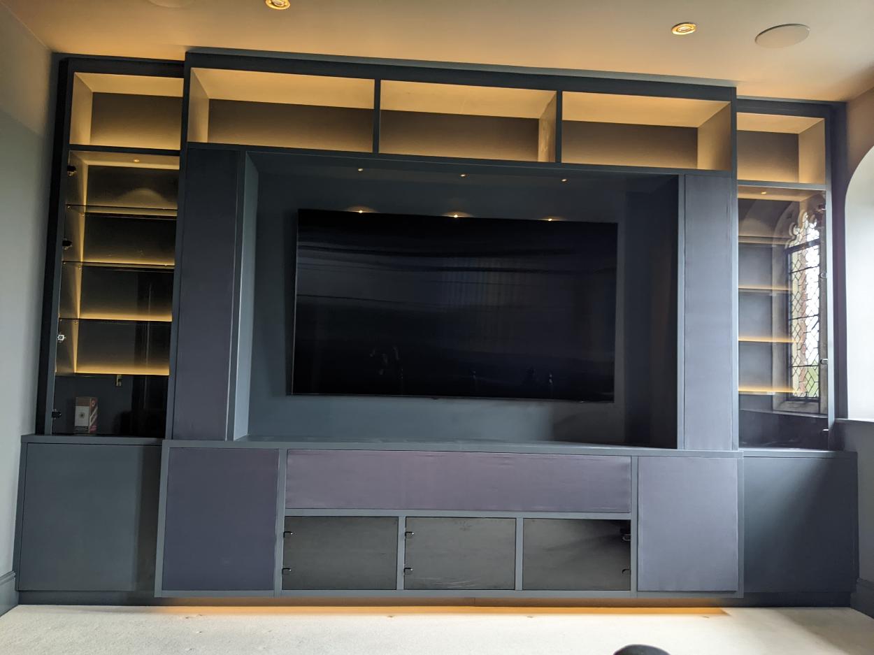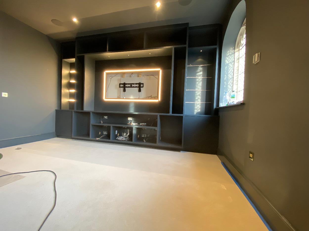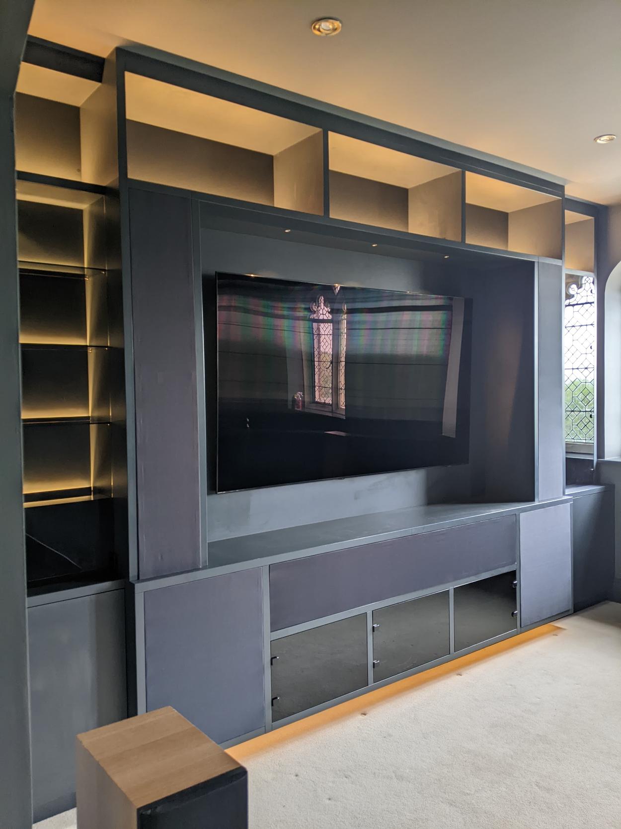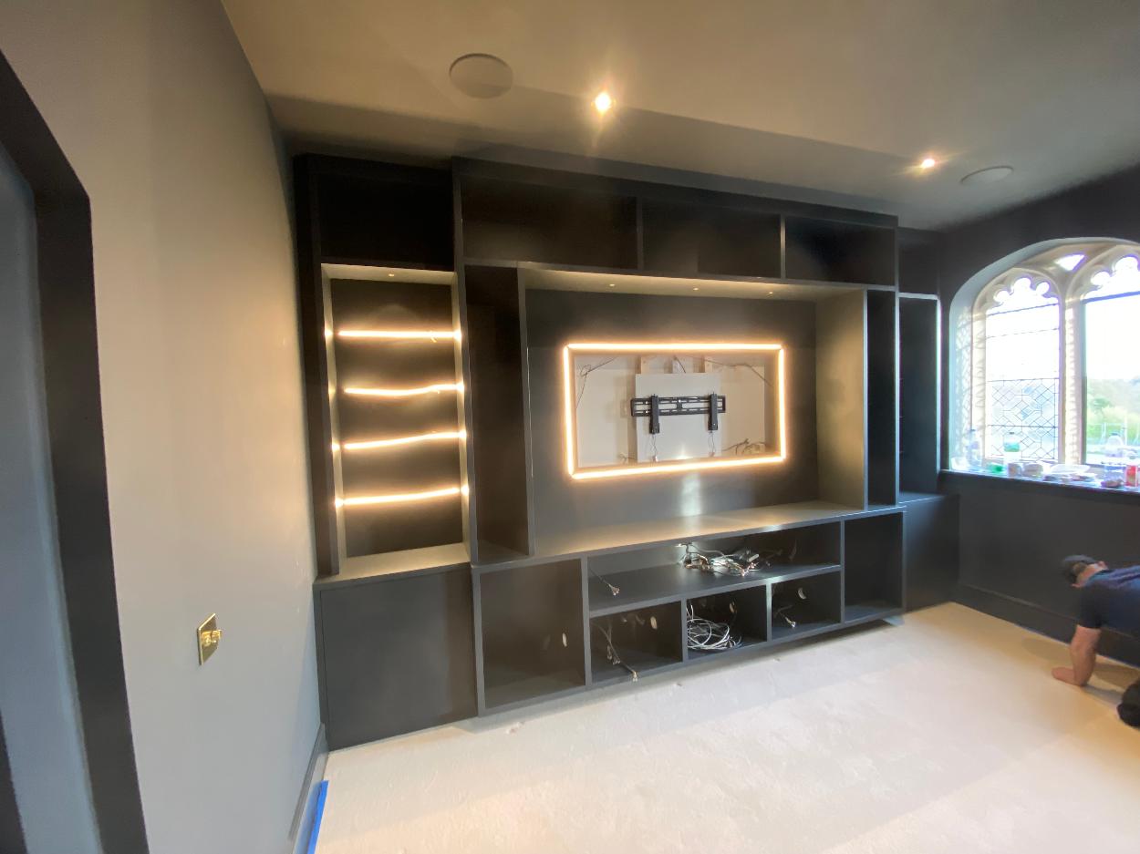 Exceptional 36mm TV MEDIA UNIT in Reading Bespoke TV MEDIA UNIT with LED's. Materials used: 36mm CARBON GREY Dimmable LED's and spot lights Made to measure Click below to see our work! See our Work