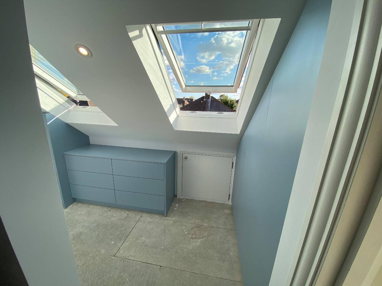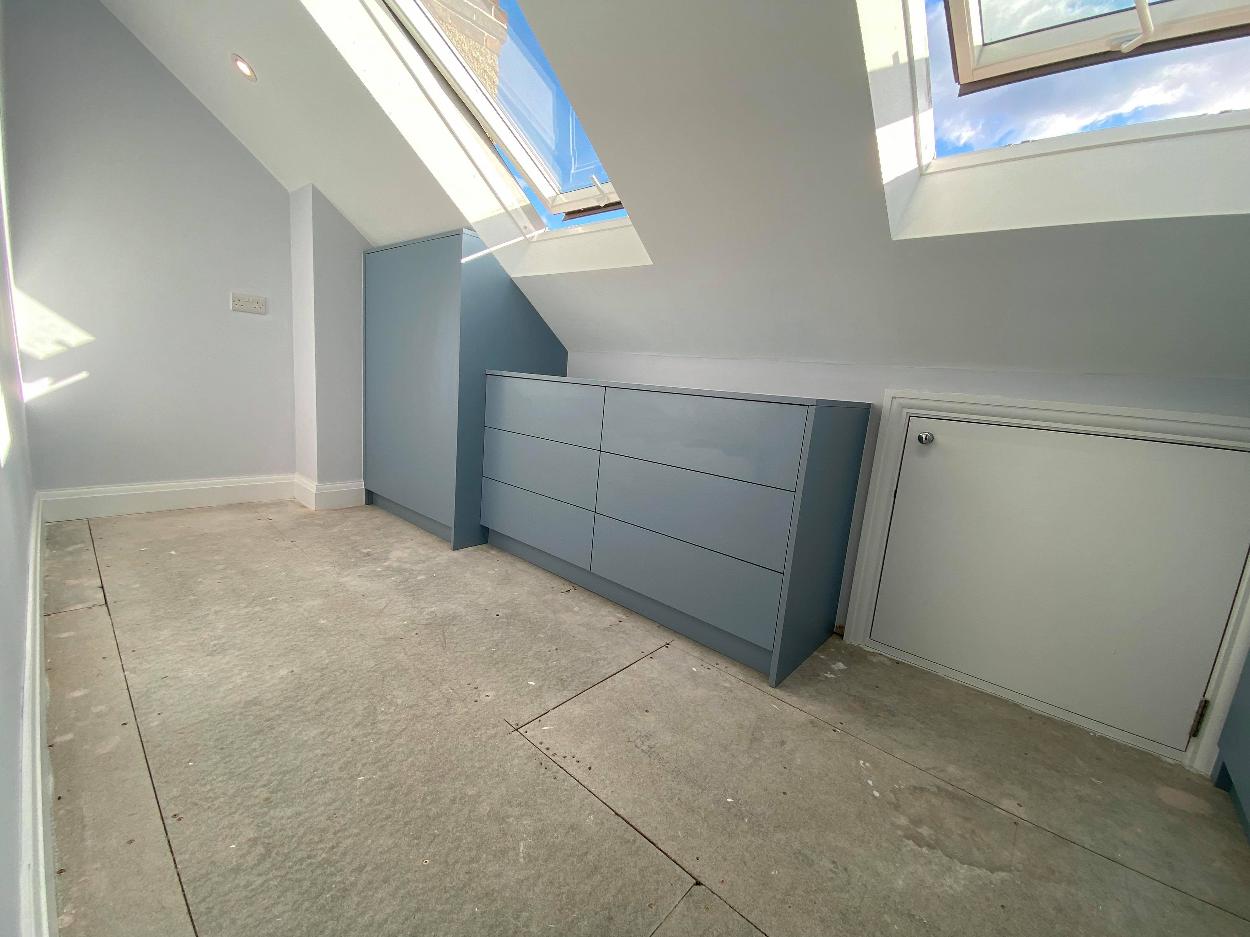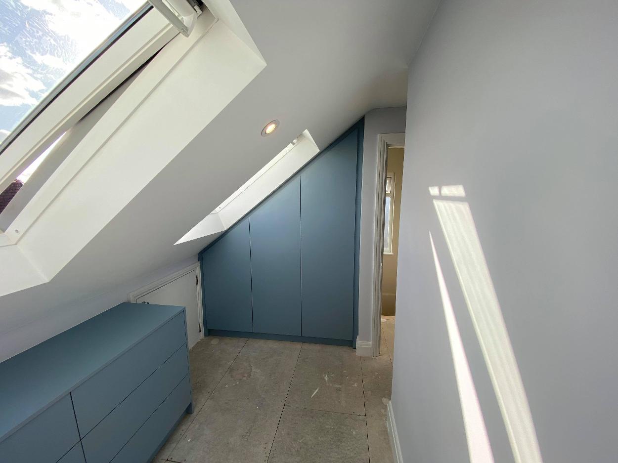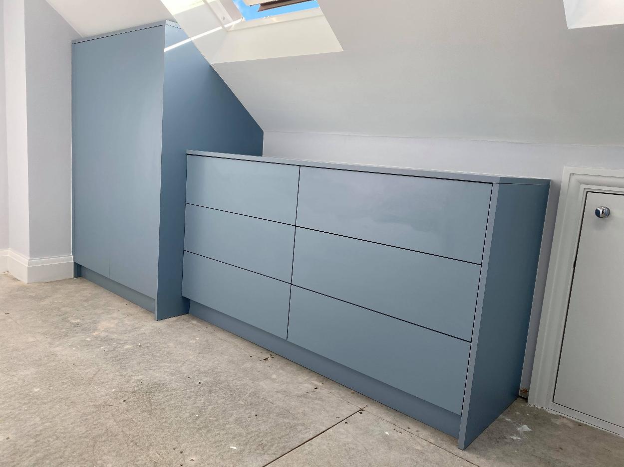 Denim Blue Loft Solution If you looking to transform your loft, please check at this modern wardrobe and storage place. Materials used: 18mm EGGER board DENIM BLUE Click below to see our work! See our Work