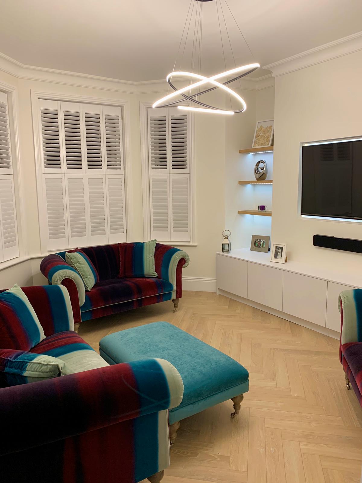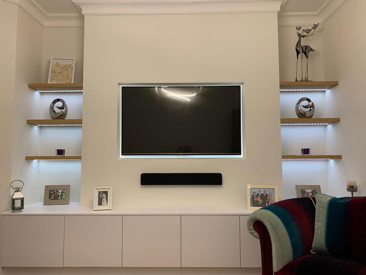 Modern and straightforward Tv-Unit upgrade. It is the best use of space in between chimney pockets. New cabinets are being made from Glacier White Egger production colors. With a solid 18mm carcass and 36mm shelves. Moreover, led lights to give that incredible look when it is dark. Looks outstanding in a living room for its design. If you have a similar space and an idea, please contact our professional team.