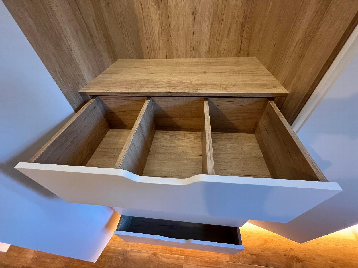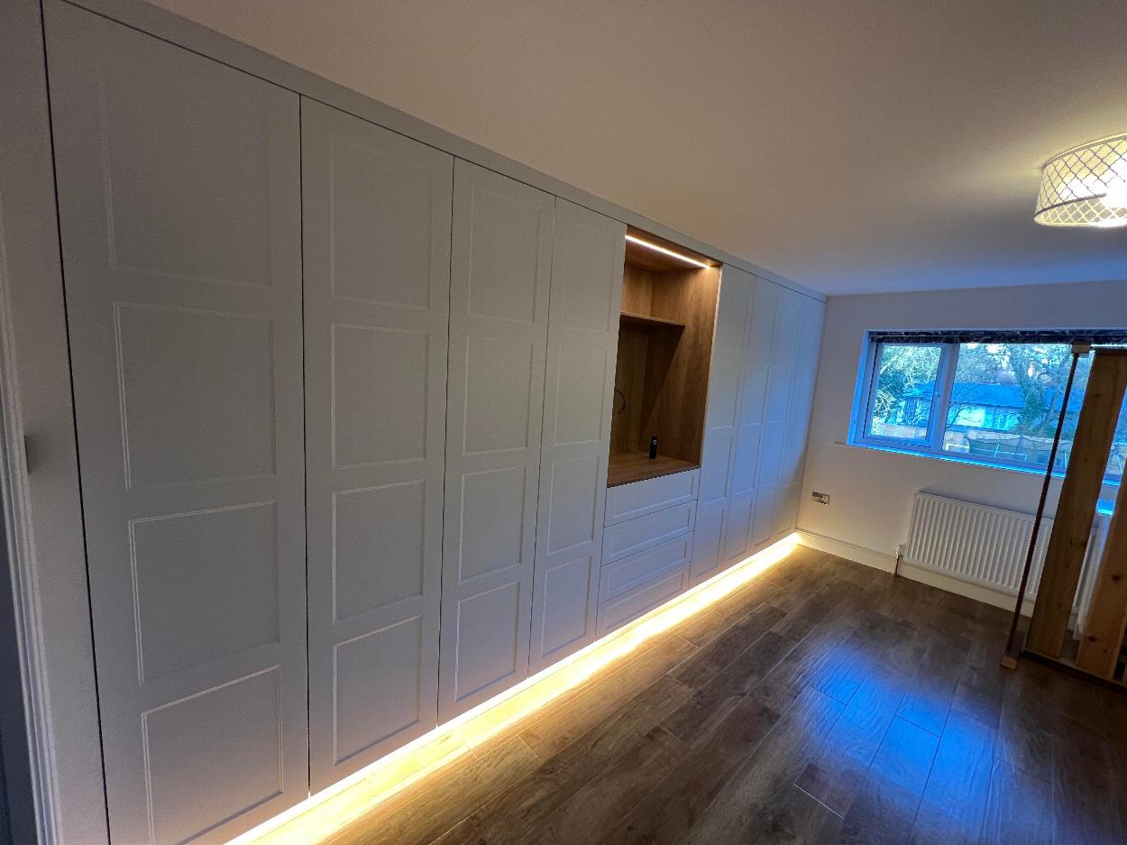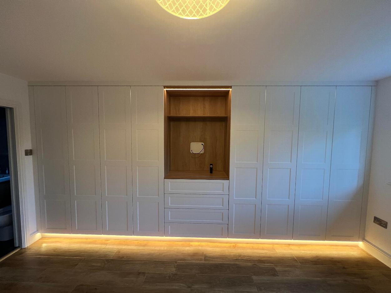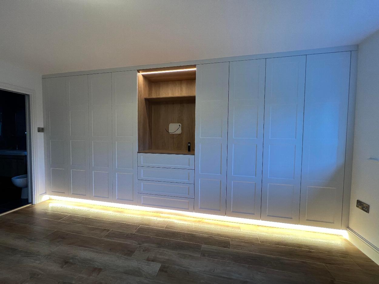 Bespoke shaker style wardrobe. Motion sensor LEDs inside the wardrobe. Exterior - color-changing LEDs. Space is utilized to get the most out of it. TV space in the middle to make sure no space is wasted.